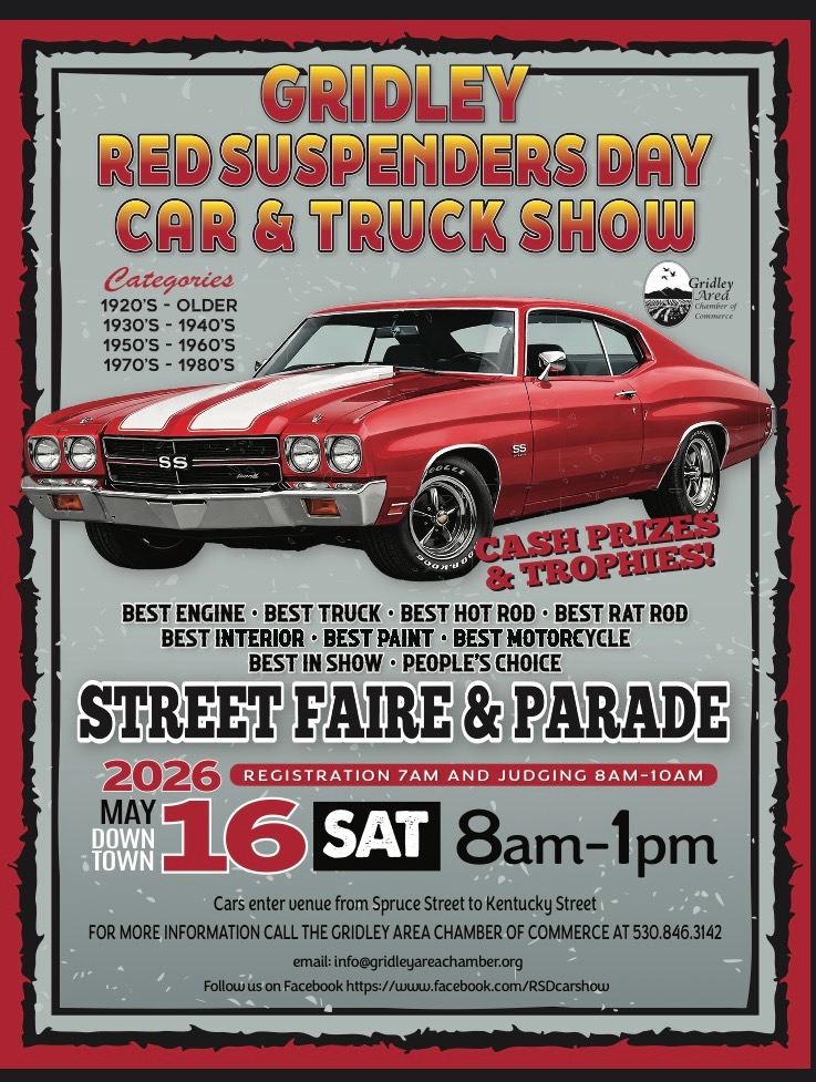 Red Suspenders Day is a Gridley tradition that is enjoyed by all. Festivities begin on Friday, May 15th with our “Unjustice Court” and Fireman Softball Games and then continues through Saturday, May 16th with a pancake breakfast, bed races, parade, vendors, and so much more! Please check out our Red Suspenders Day page on how to become a Sponsor, Vendor, or Parade Entry!